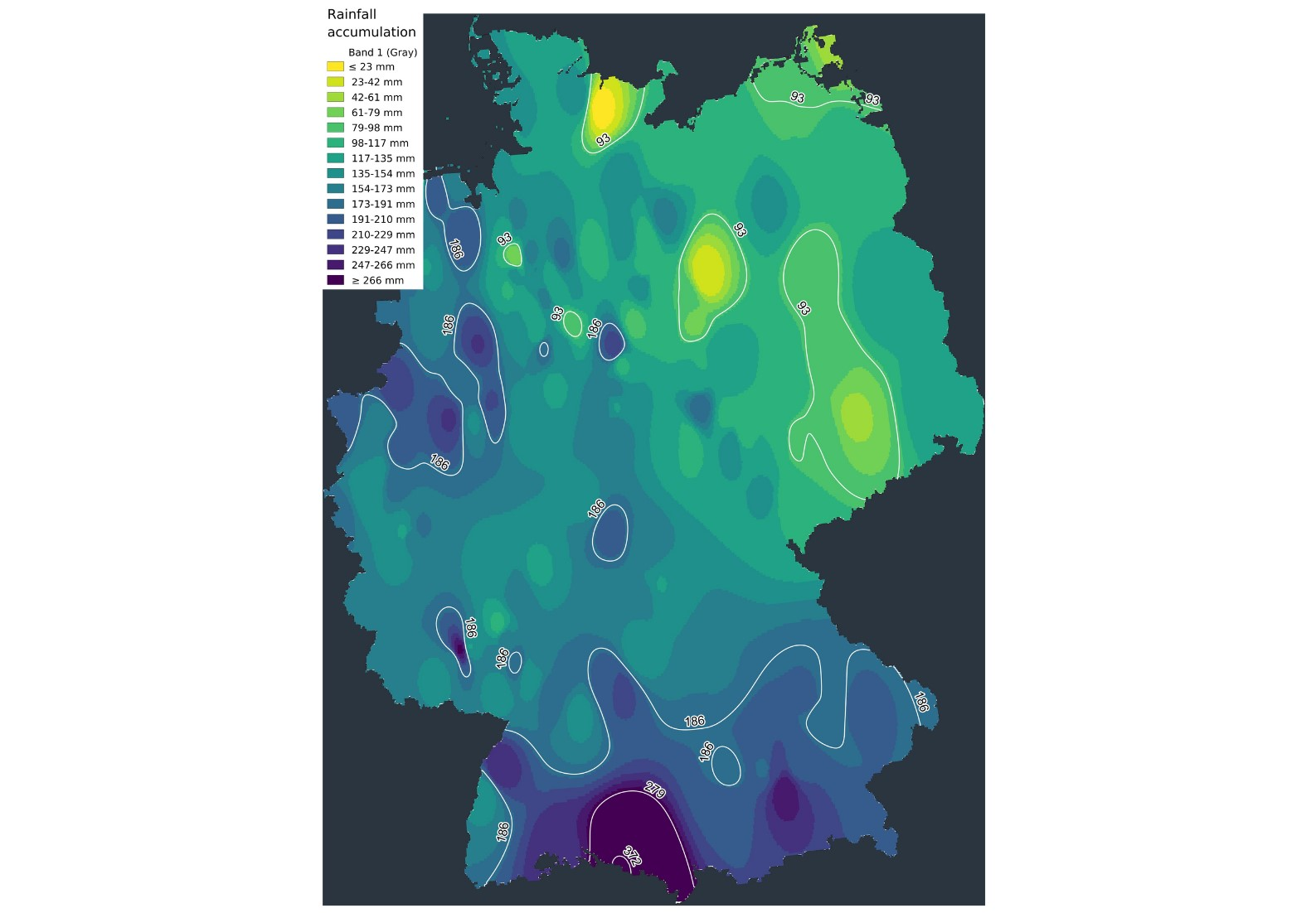Der Mai war jedoch besonders trocken und führte zu einer weiteren Austrocknung der obersten Zentimeter des Bodens, insbesondere in einer Tiefe von 0 bis 40 cm. Die meisten Niederschläge fielen in West- und Süddeutschland mit bis zu 383 mm in der Region Traunstein.