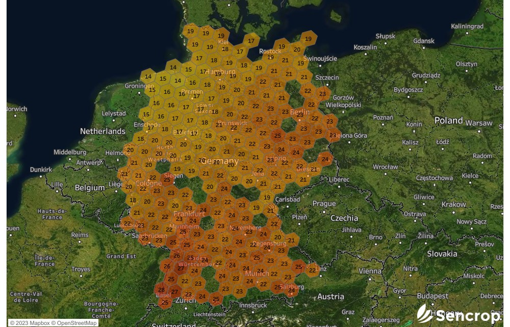 Im Allgemeinen waren die Niederschläge über Deutschland großzügig. Laut den offiziellen Daten des DWD fielen im Frühjahr 2023 14,8 % mehr Niederschläge als üblich. Besonders viel Regen fiel in der ersten Saisonperiode, im März und April, auf das Sencrop-Netzwerk. Diese Feuchtigkeit half der Vegetation und den Kulturen, sich zu entwickeln.