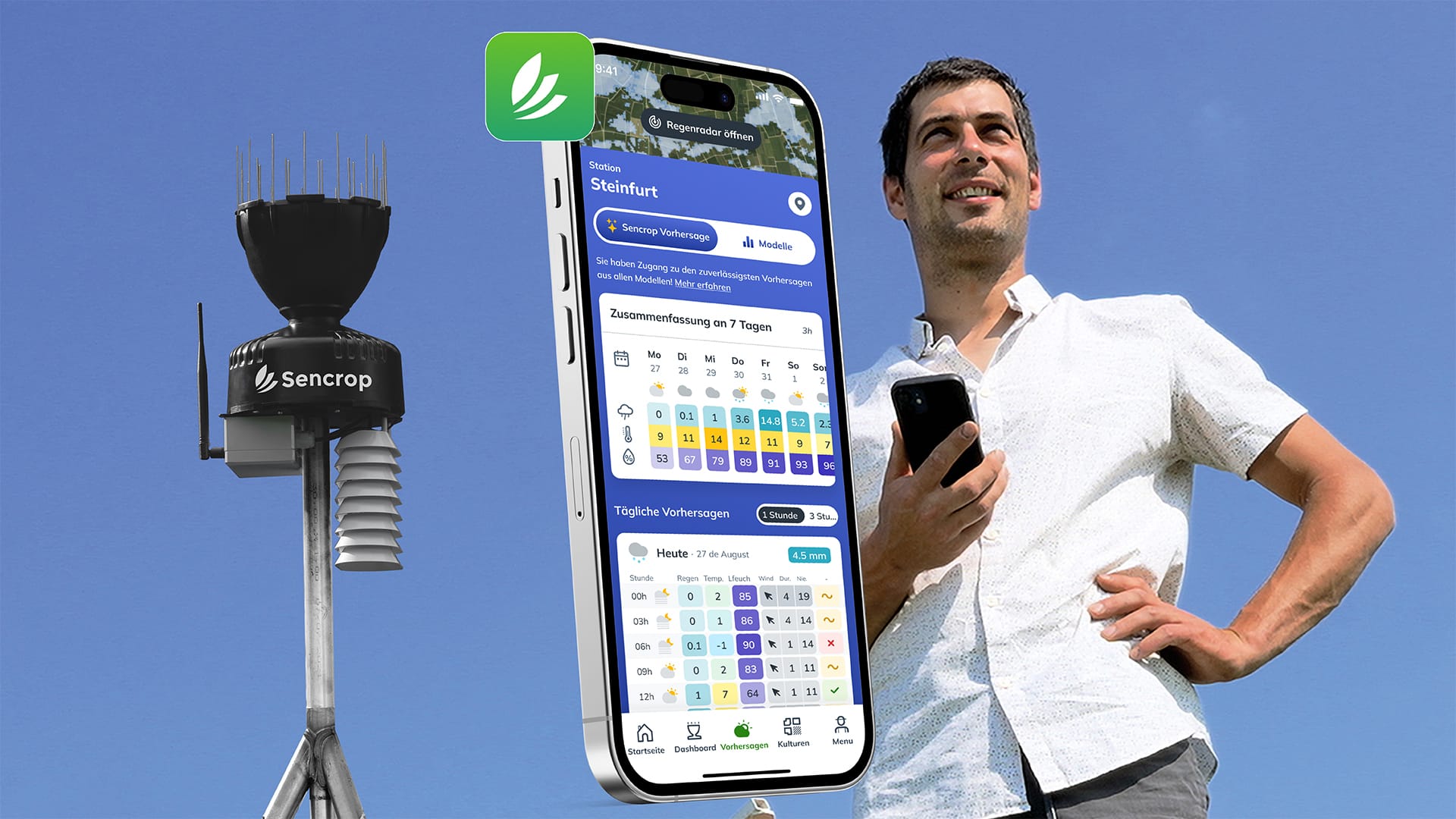 SENCROP IN ZAHLEN - Umsatz: 8 Millionen Euro - 80 Mitarbeiter in Europa - 32 Millionen täglich gesammelte Wetterbeobachtungen - 40 Wettervorhersagemodelle, die in der App zugänglich sind - 1,5 Milliarden Wettervorhersagedaten, die täglich mit lokalen Daten verglichen werden - Offene Plattform mit 36 Krankheitsmodellen, Parzellen-Software und anderen Drittanbietermodellen