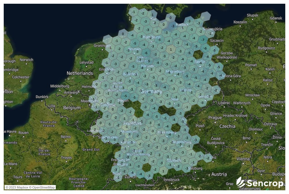 Die Niederschläge waren letztes Jahr zur gleichen Zeit viel weniger großzügig. Am 26. November lagen die meisten Sencrop-Wetterstationen weit über den Niederschlagssummen, die im gleichen Zeitraum im Jahr 2022 gemessen wurden. Obwohl die östliche Mitte Deutschlands die Region mit den wenigsten Niederschlägen bleibt, überschreiten die Niederschlagssummen manchmal 200 Liter Wasser pro Quadratmeter, obwohl der Monat noch nicht zu Ende ist ... hier der Vergleich!