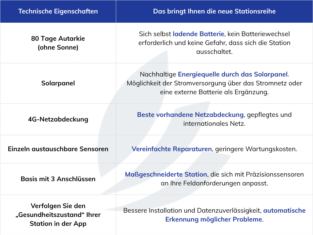 Zuverlässige Daten sind ohne ordnungsgemäß installierte Stationen nicht möglich. Zusätzlich verbessern wir nun auch die Überwachung Ihrer Anlage. Mit der neuen Generation von Wetterstationen können wir nun mehr Elemente überwachen und Ihnen mehrere Überwachungsoptionen anbieten: