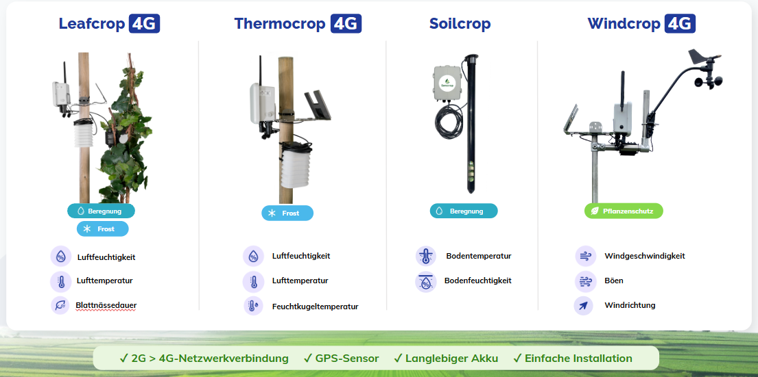 Sencrop 4G: Das Wesentliche zum Wetter in einer Wetterstation Sencrop 4G+: die ideale Wetterstation zur Optimierung der Behandlungen Sencrop 4G+ ETP: die komplette Wetterstation zur Verwaltung von Wetter, Behandlungen und insbesondere Bewässerung.Leafcrop 4G: die Präzisionswetterstation zur Überwachung von Blattkrankheiten und Frost (zum Aufstellen in der Nähe der Blätter) Thermocrop 4G: Die Station zur Temperaturüberwachung inmitten des Laubes (Frost) Windcrop 4G: Die Station zur Windmessung Soilcrop 4G: Die Station zur Überwachung des Wasserbedarfs Ihres Bodens (kapazitive Sonde)