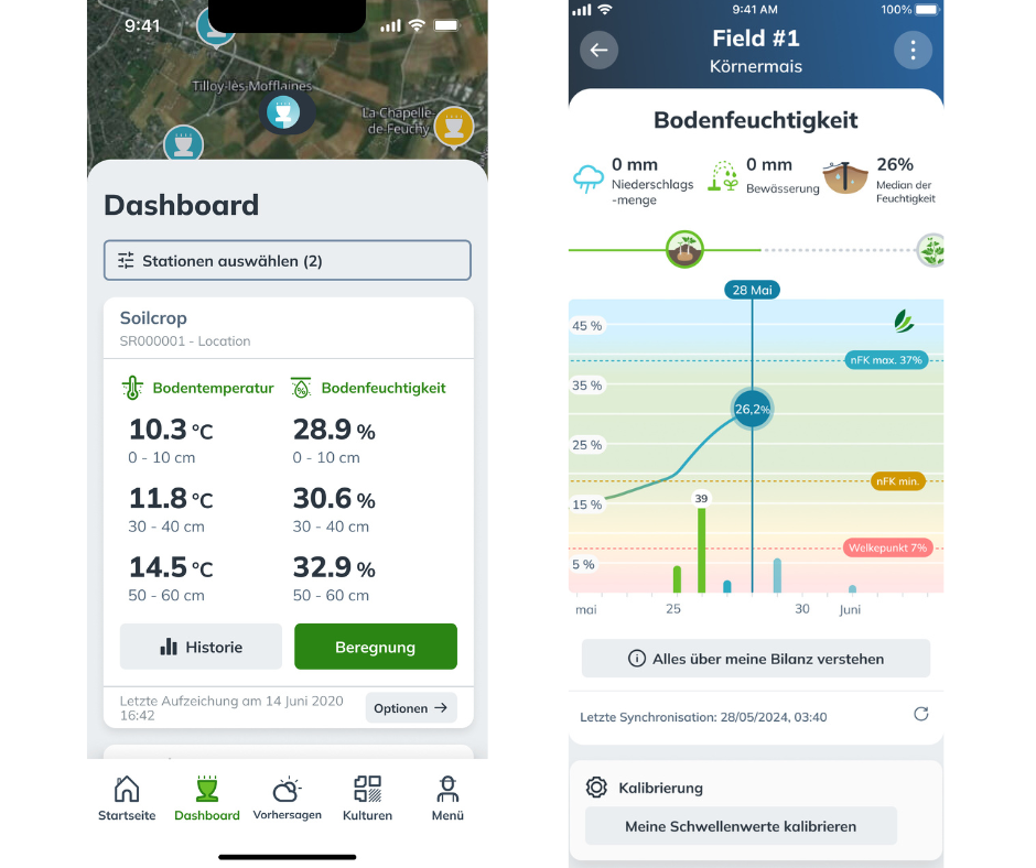 Das Gerät ist mit einem Fernübertragungssystem verbunden, das eine Grafik ausgibt. Dort kann man die Entwicklung der Bodenfeuchtigkeit zwischen der Feldkapazität (Boden, der vollständig mit Wasser gesättigt ist) und dem unteren Ende der leicht nutzbaren Bodenreserve (RFU) sehen, anhand derer man erkennen kann, wenn die Pflanze unter Wasserstress steht.
