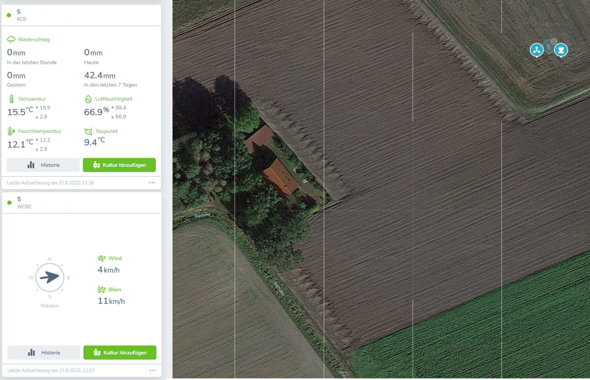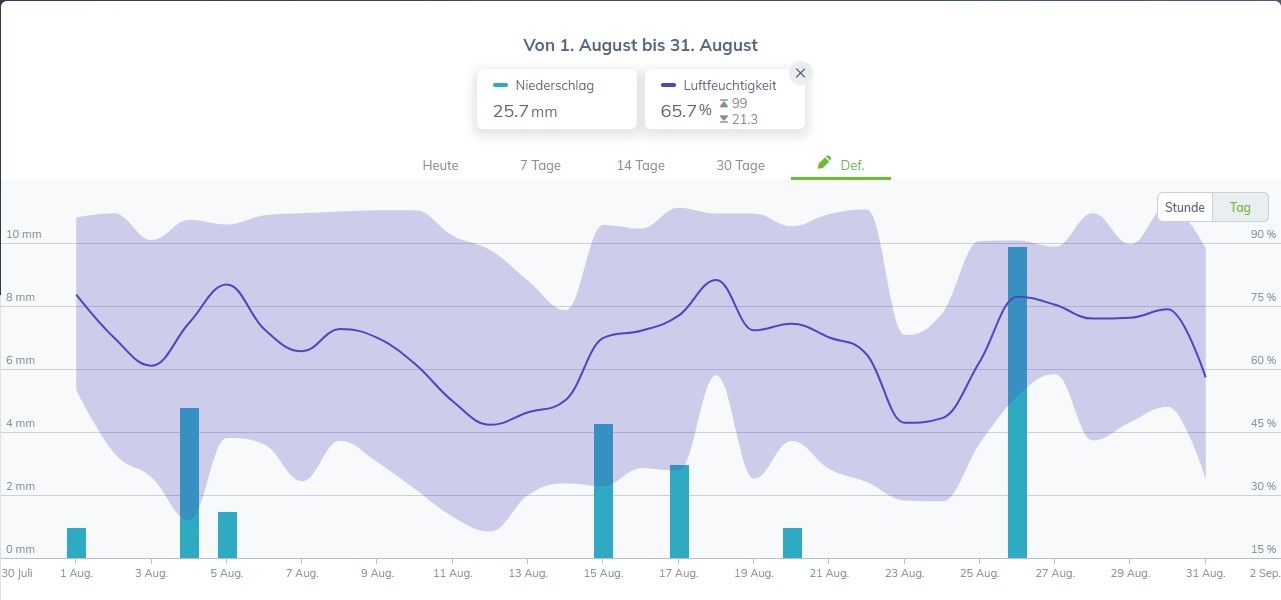 Daten von eigenen und anderen Stationen optimal nutzen: Beispiel für Niederschlag und Luftfeuchtigkeit im selben Feld wie oben, im August. Quelle: Sencrop