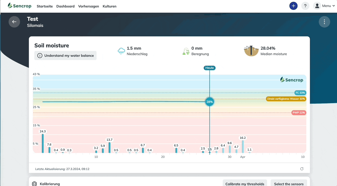 Kalibrieren Sie schließlich Ihre Feuchtigkeitsschwellenwerte: Volumenfeuchte bei Feldkapazität, niedrige nutzbare Feldkapazität und Feuchtigkeit am Welkepunkt. Je nach Bodenart stehen Ihnen vordefinierte Schwellenwerte zur Verfügung. Wenn Sie diese an Ihre Ansprüche anpassen möchten, empfehlen wir Ihnen, einen Berater hinzuzuziehen.